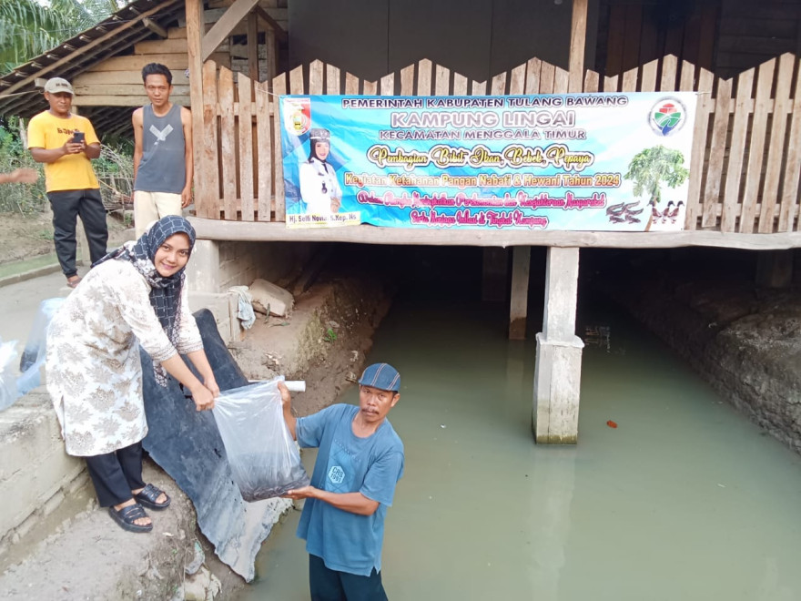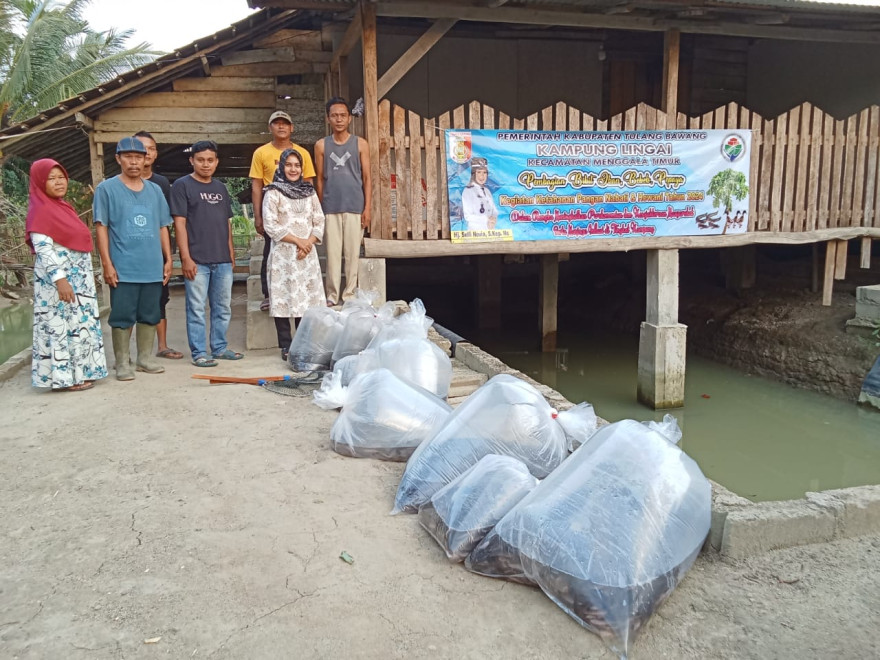 Fokus dan upaya dalam bidang ketahan pangan, Jum'at Lima Belas Maret Tahun Dua Ribu Dua Puluh Empat, Kepala Kampung Lingai Hj. Selfi Novia. S. Kep. Ns melakukan penebaran bibit ikan lele sejumlah 10.300 ekor dan bebek sebanyak 50 ekor.